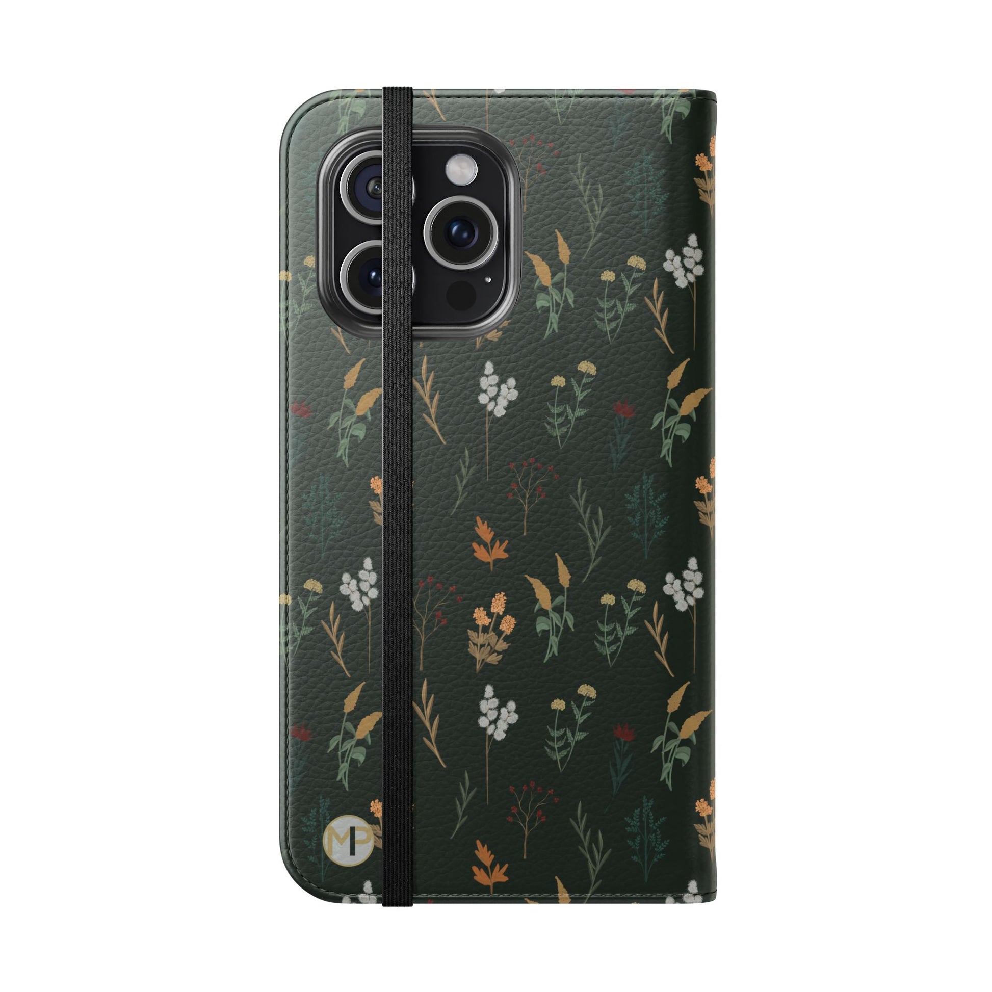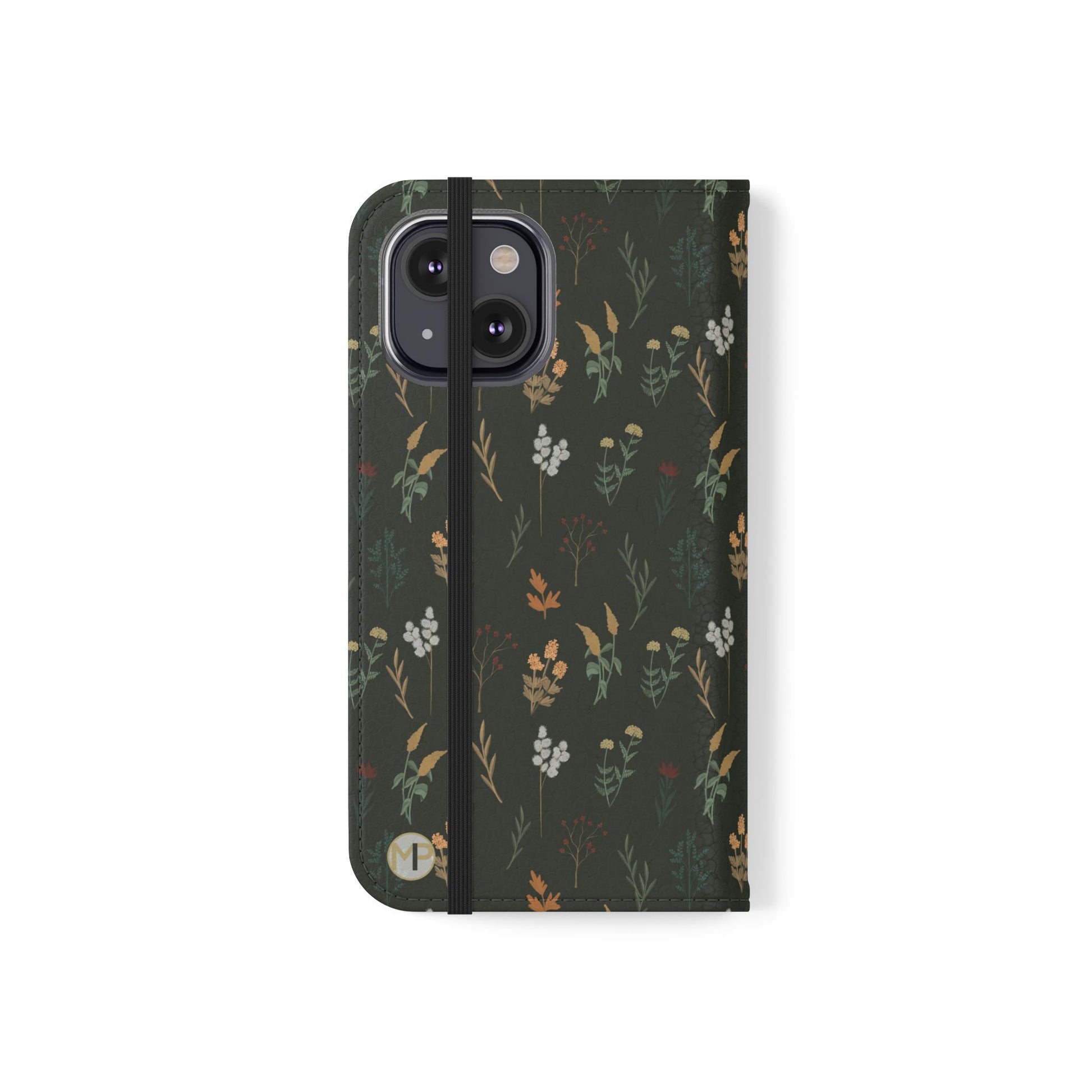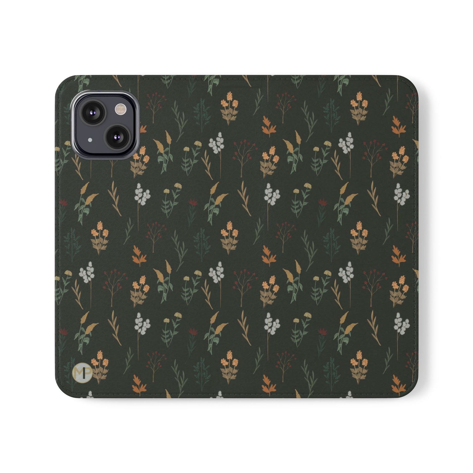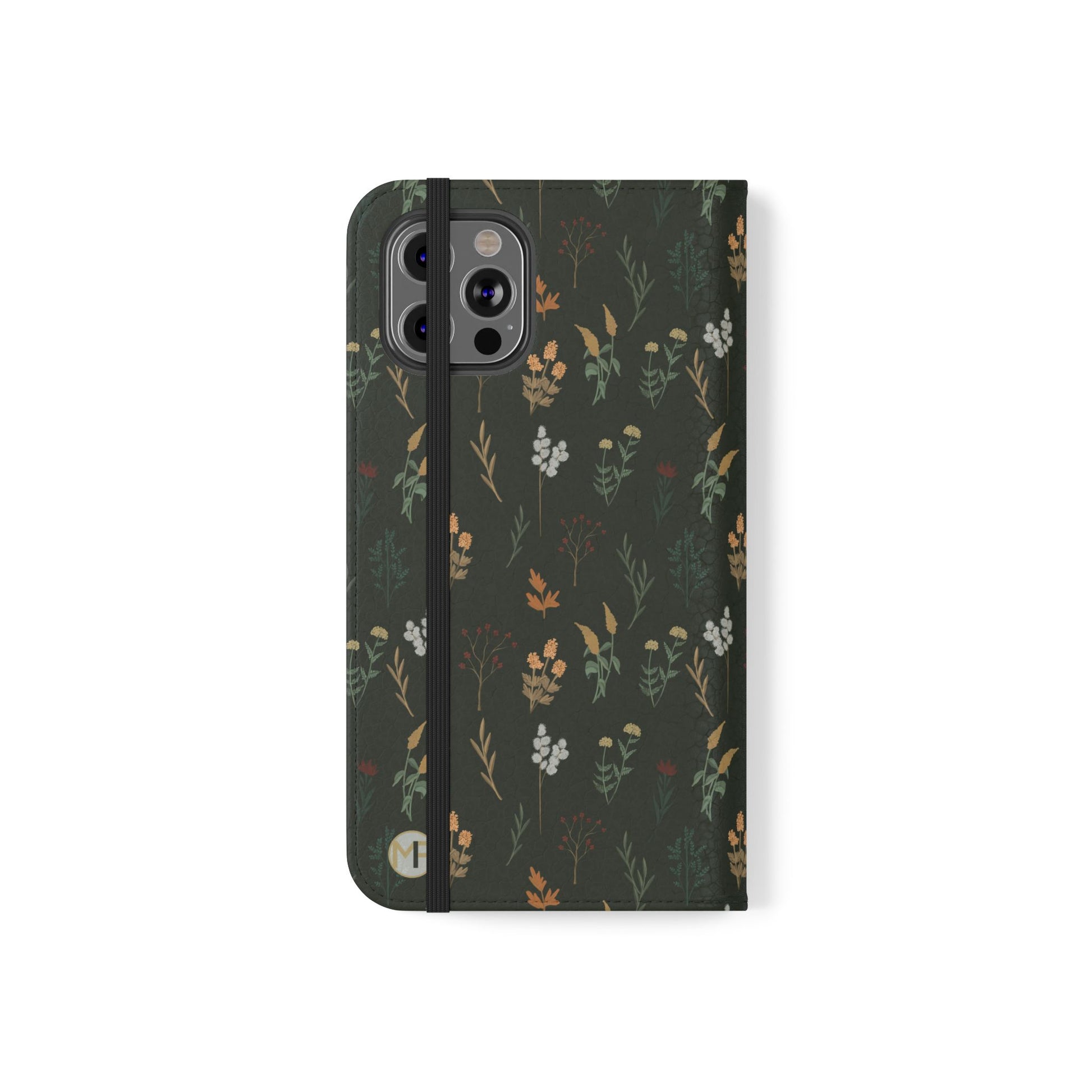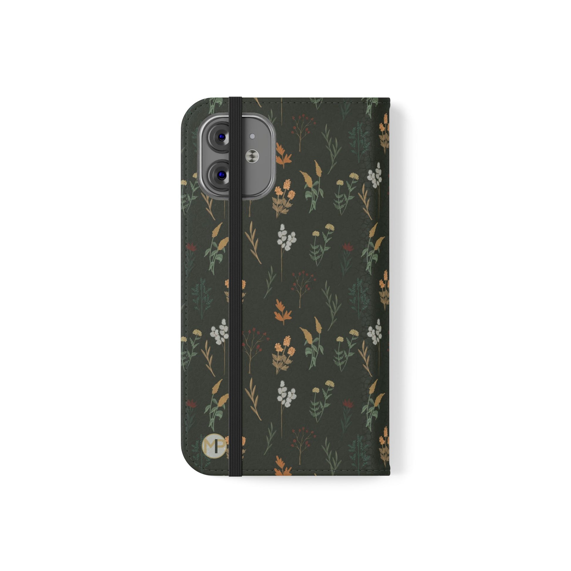 Botanical Floral Flip Phone Case — Dark Green Wallet Cover
