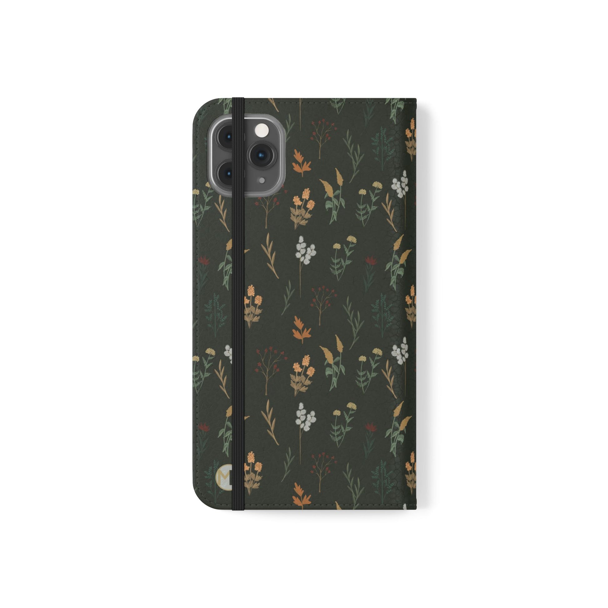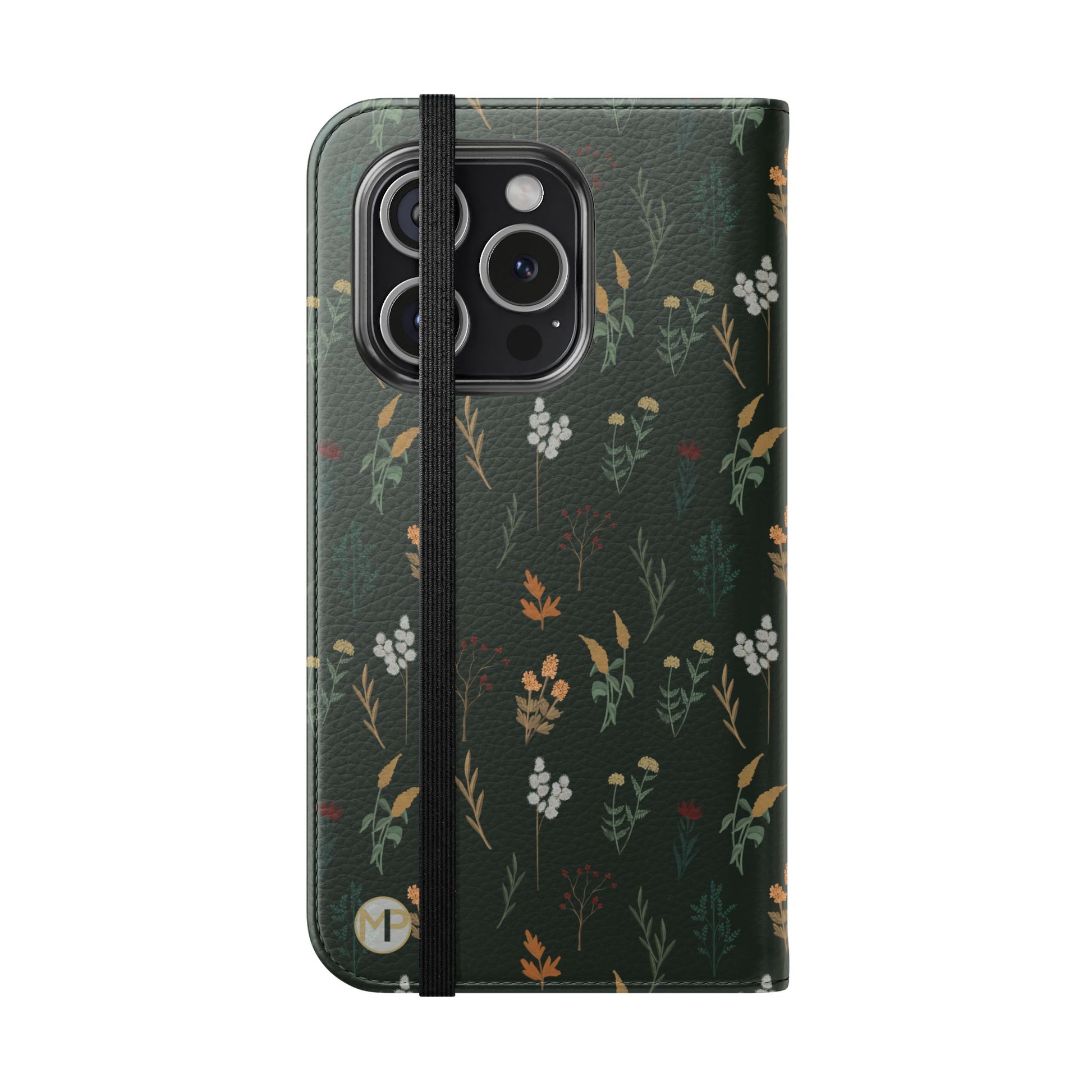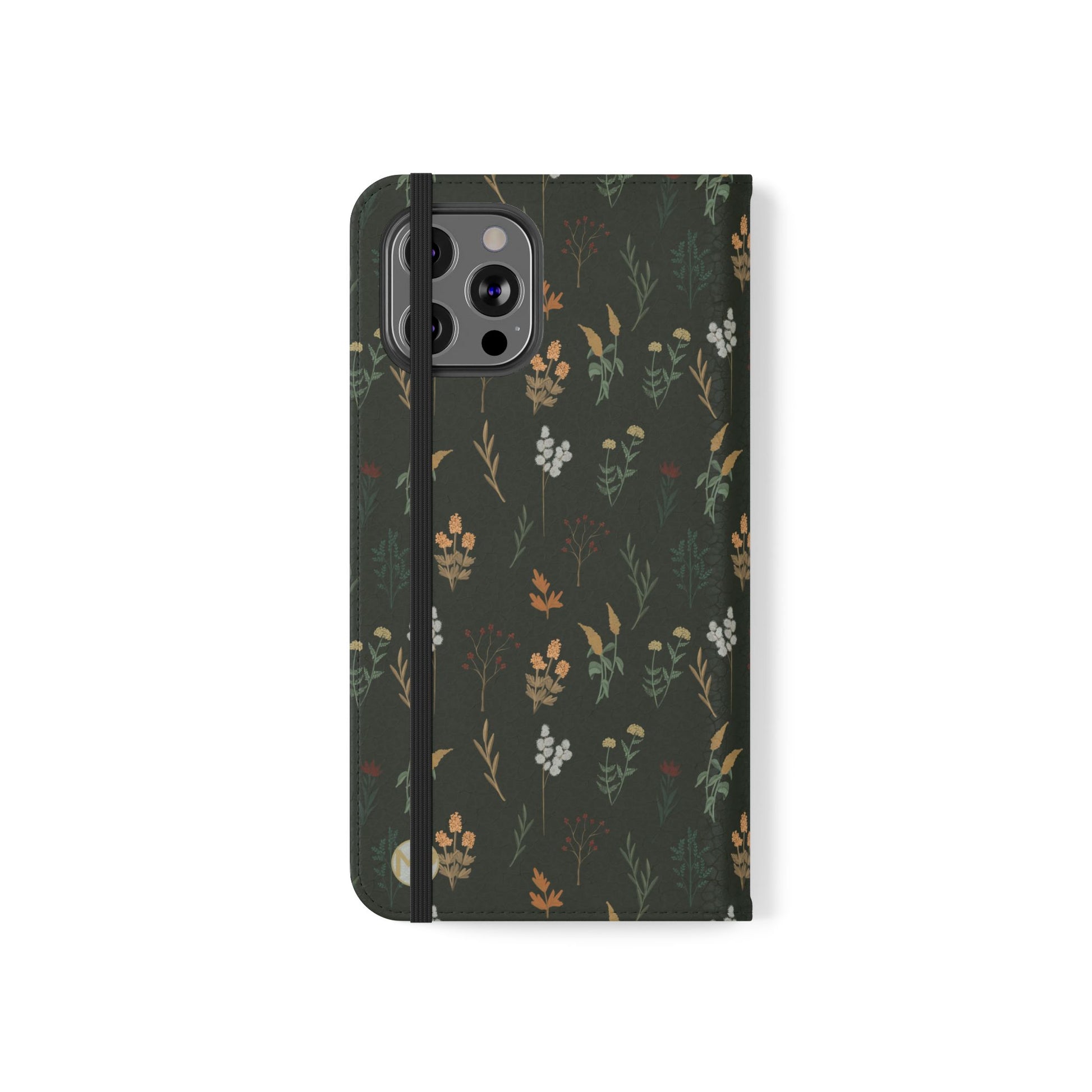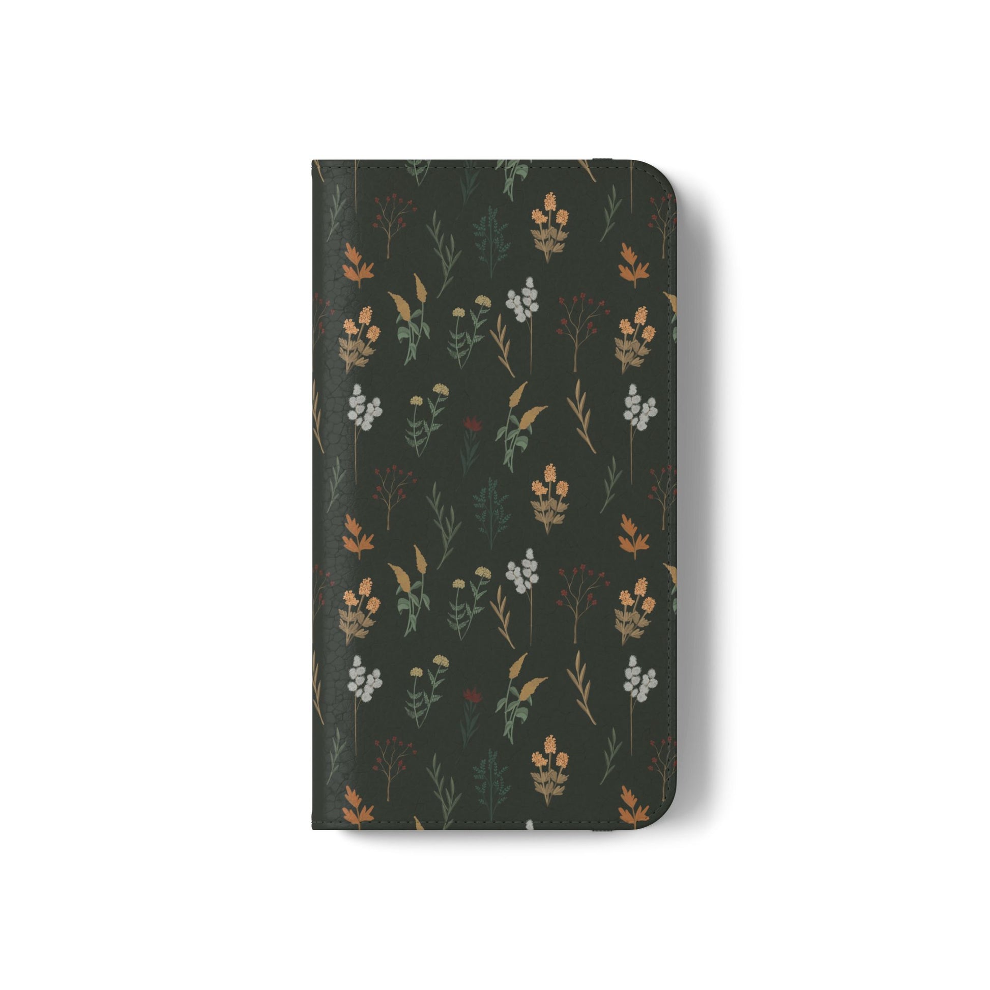 Botanical Floral Flip Phone Case — Dark Green Wallet Cover