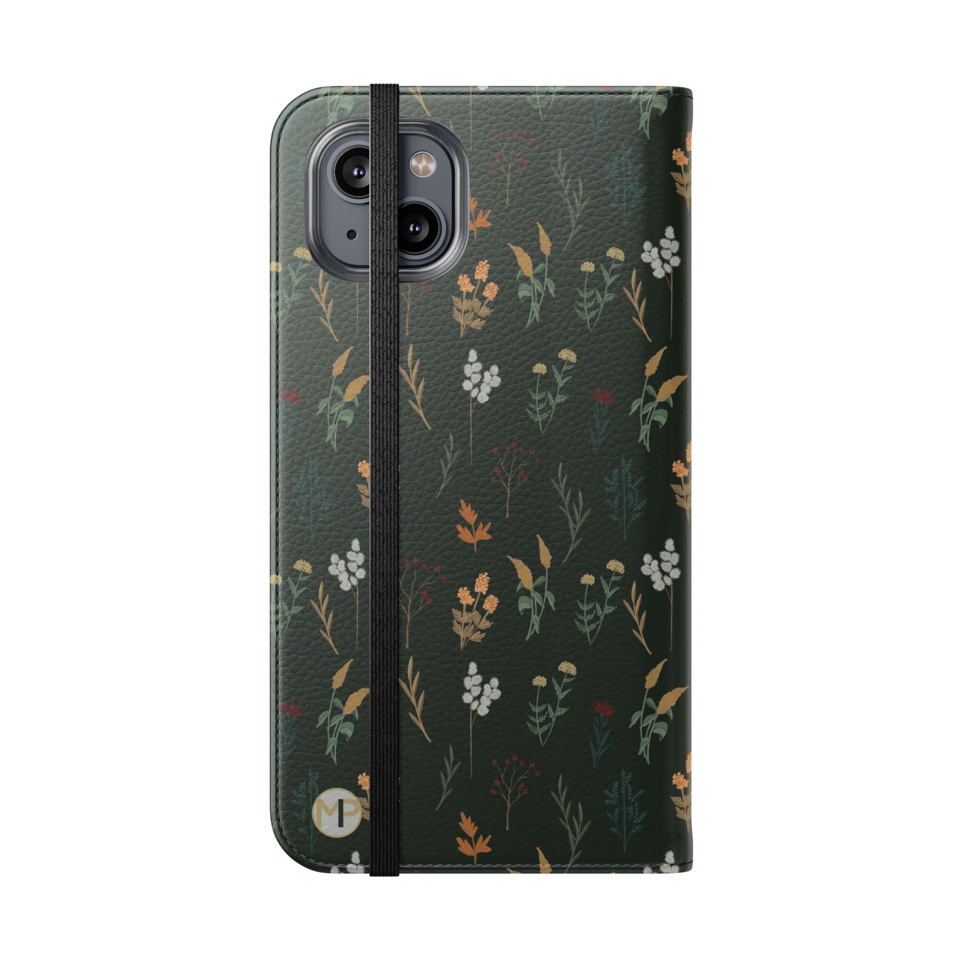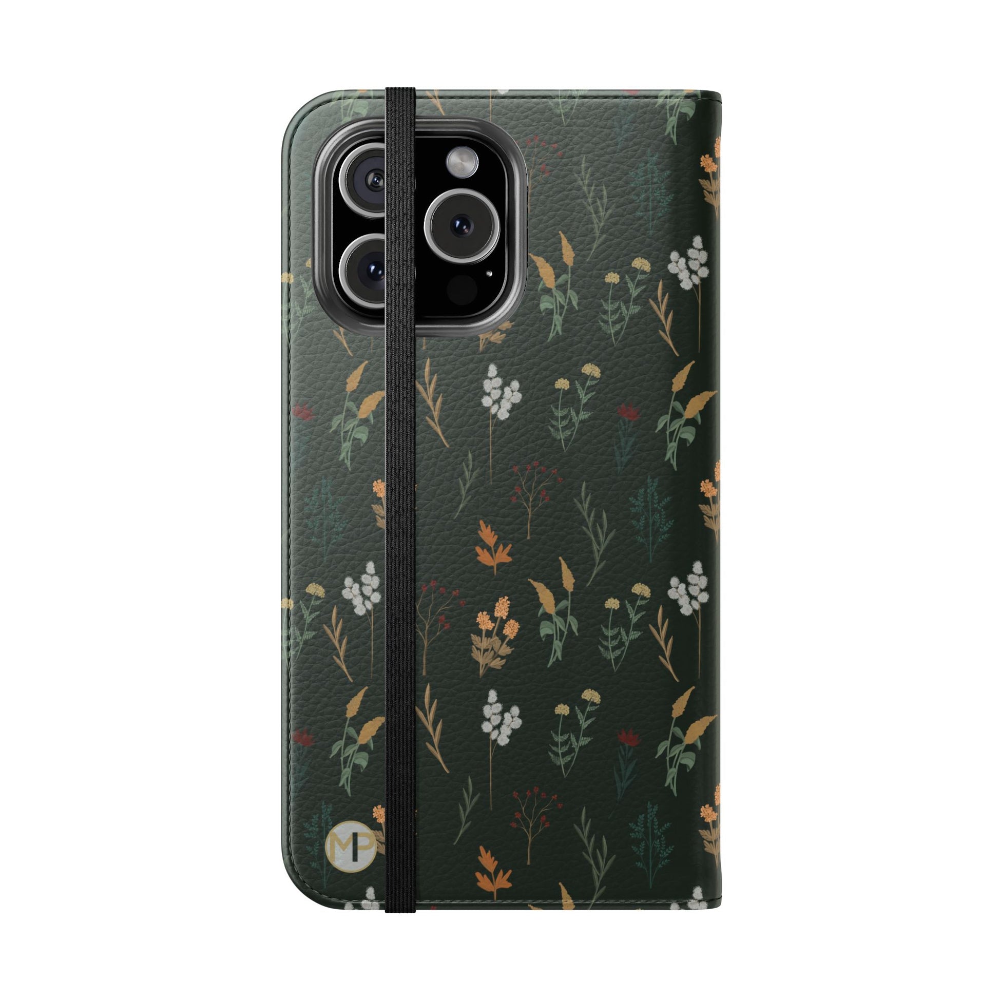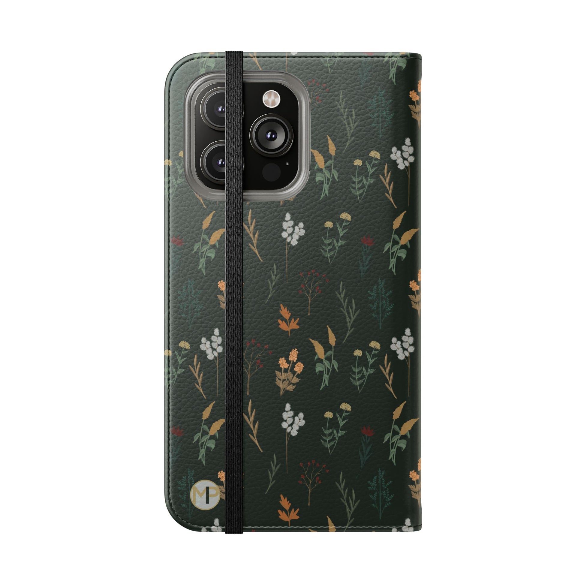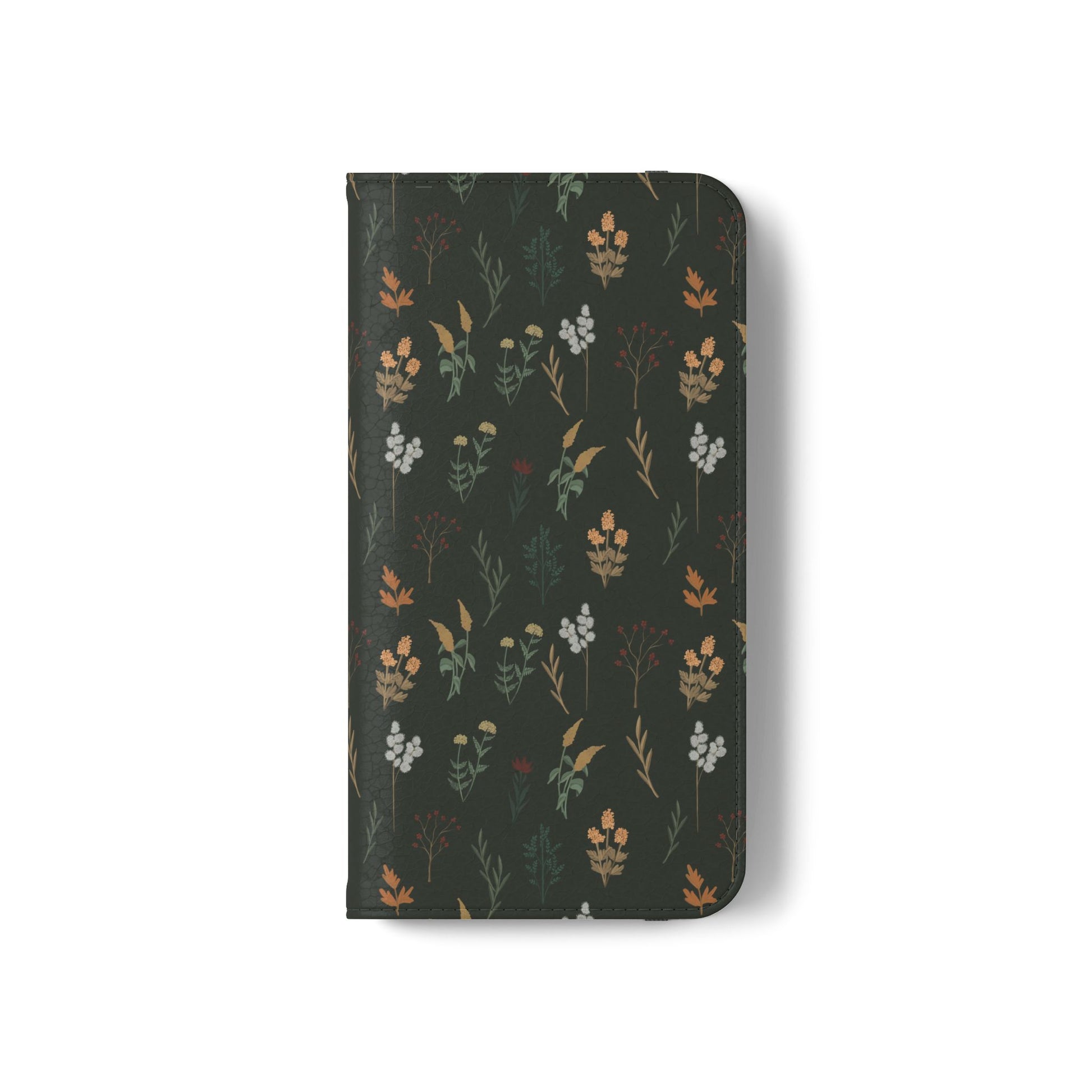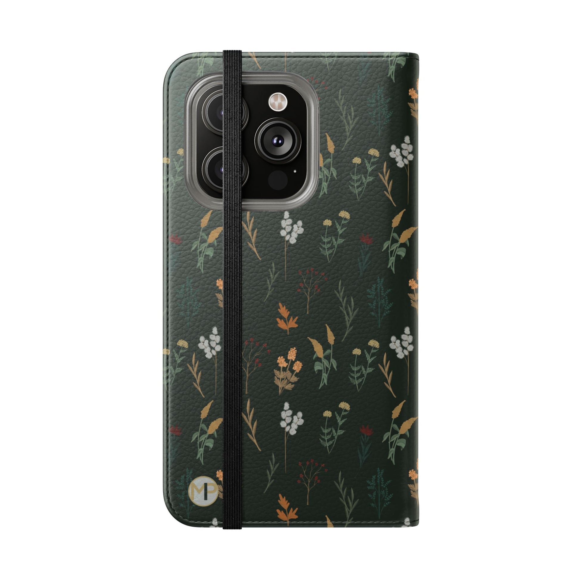 Botanical Floral Flip Phone Case — Dark Green Wallet Cover