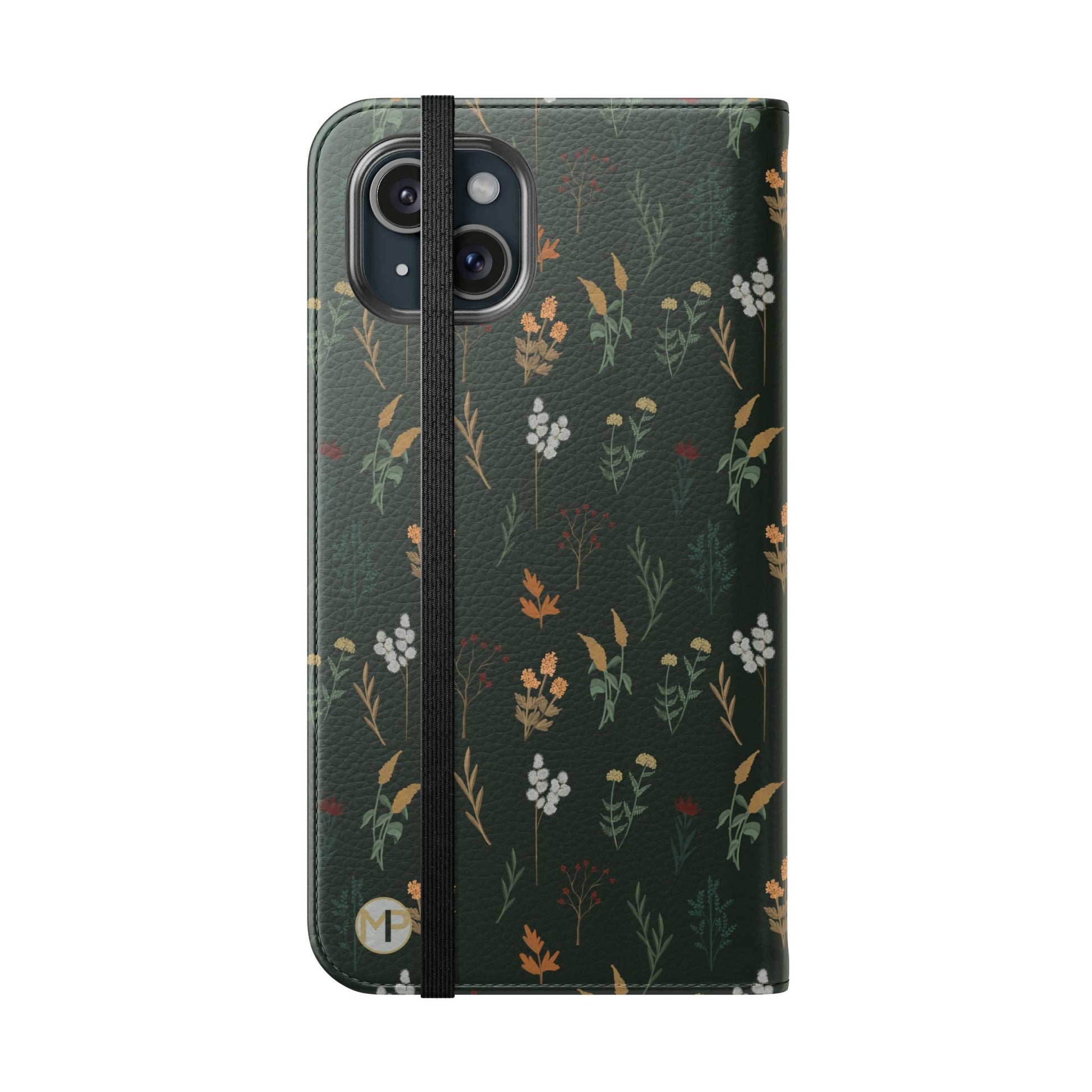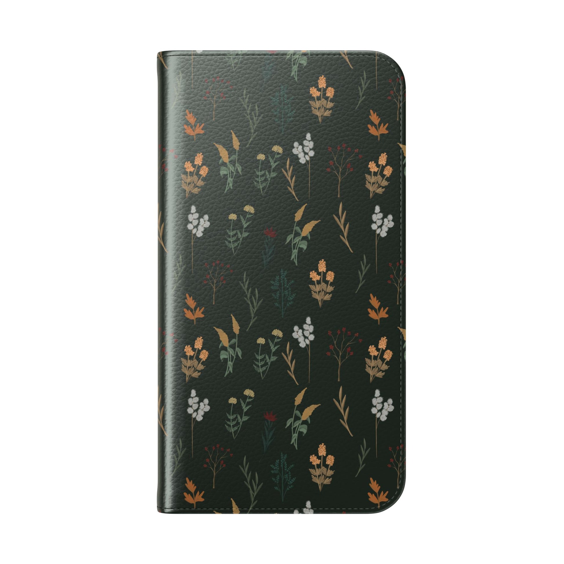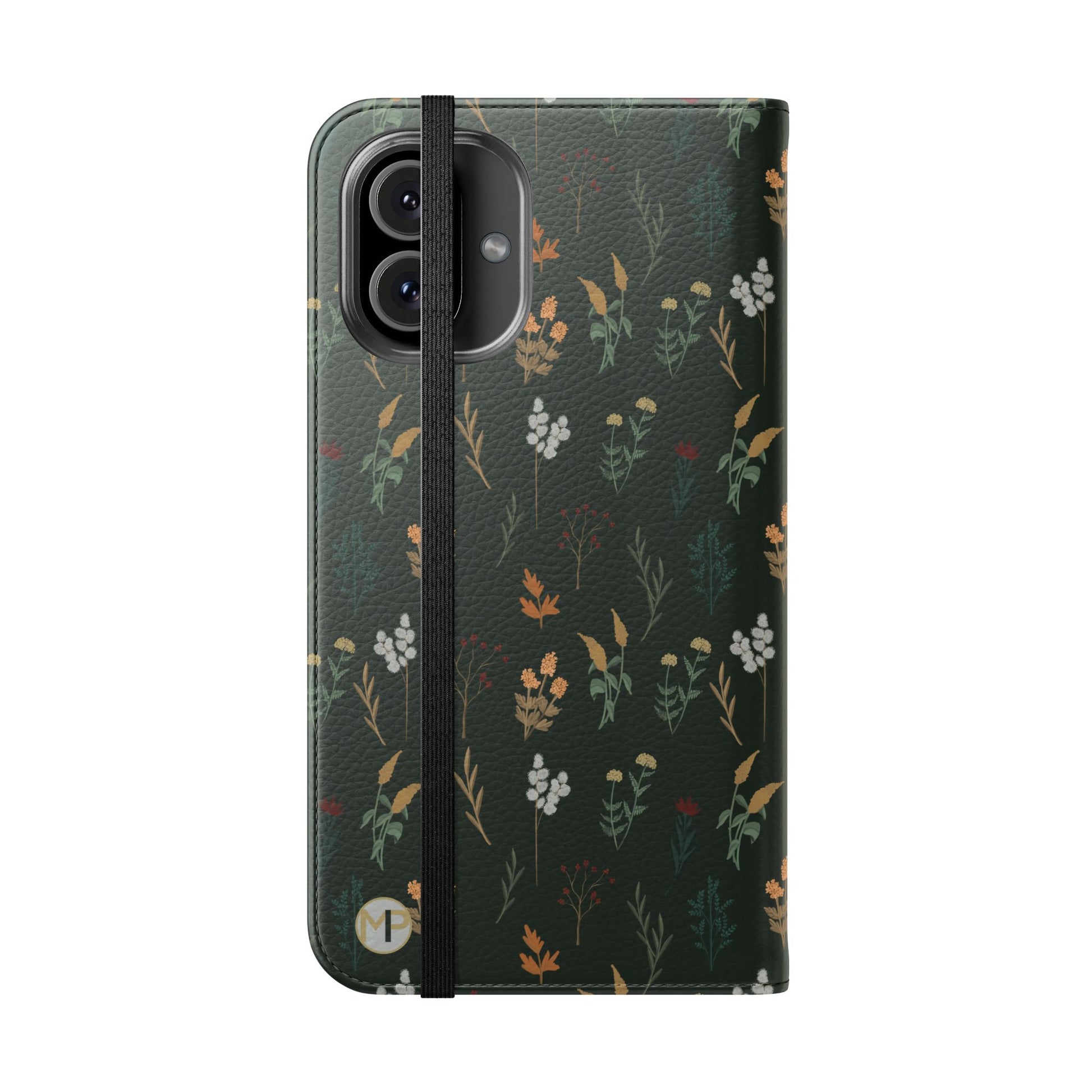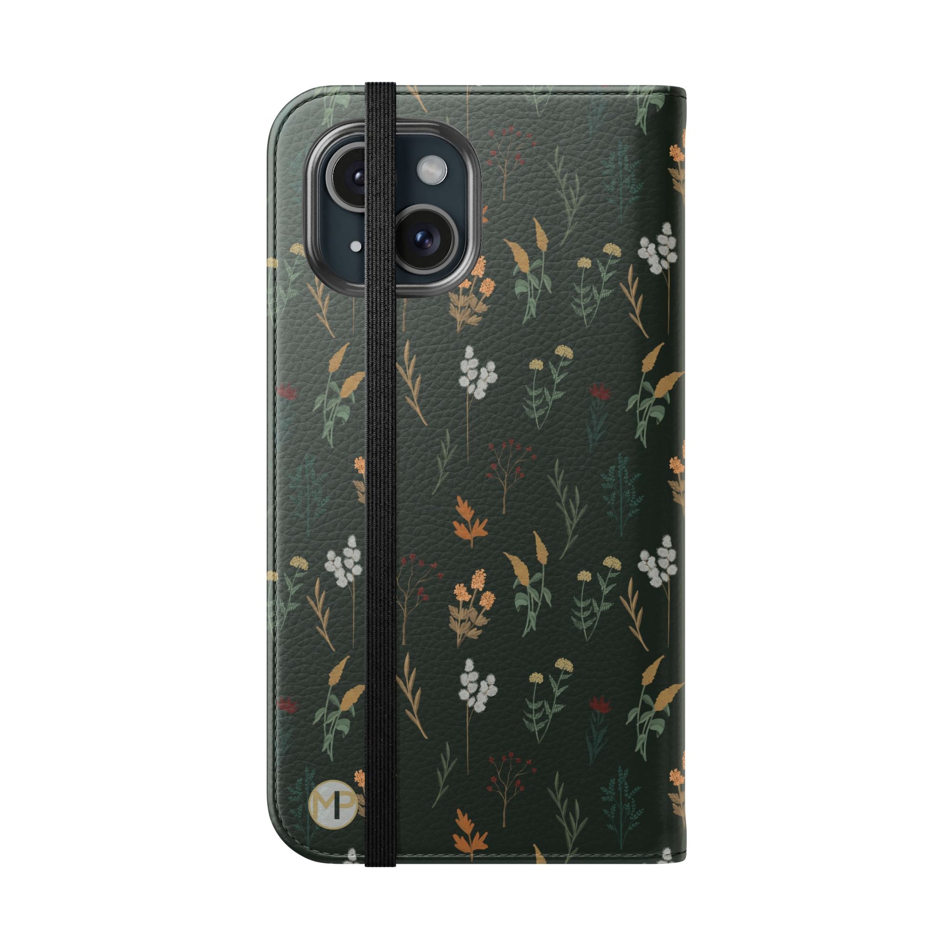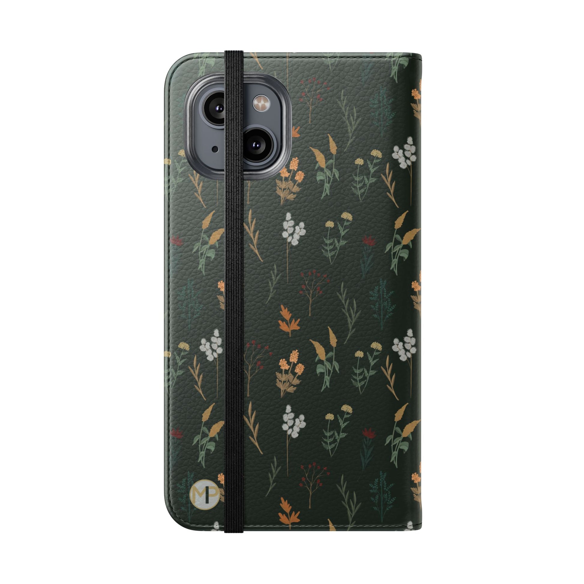 Botanical Floral Flip Phone Case — Dark Green Wallet Cover