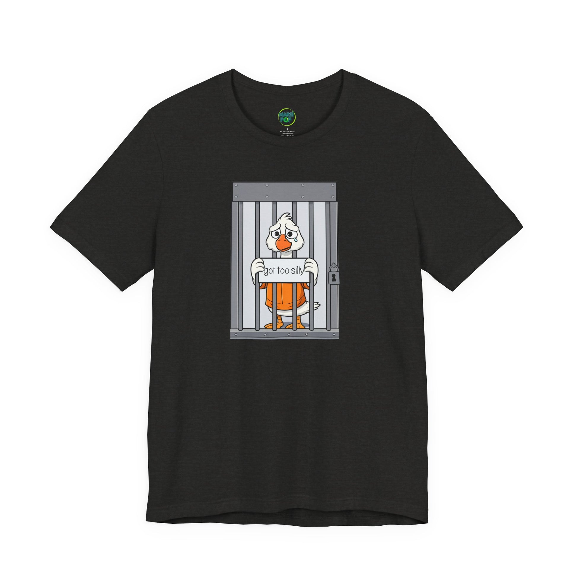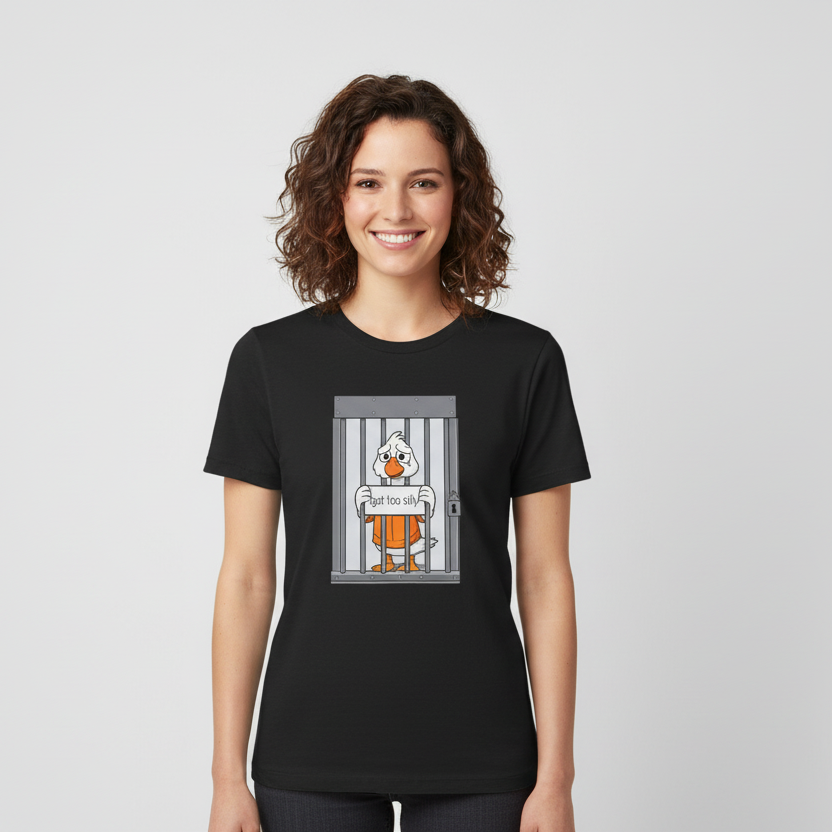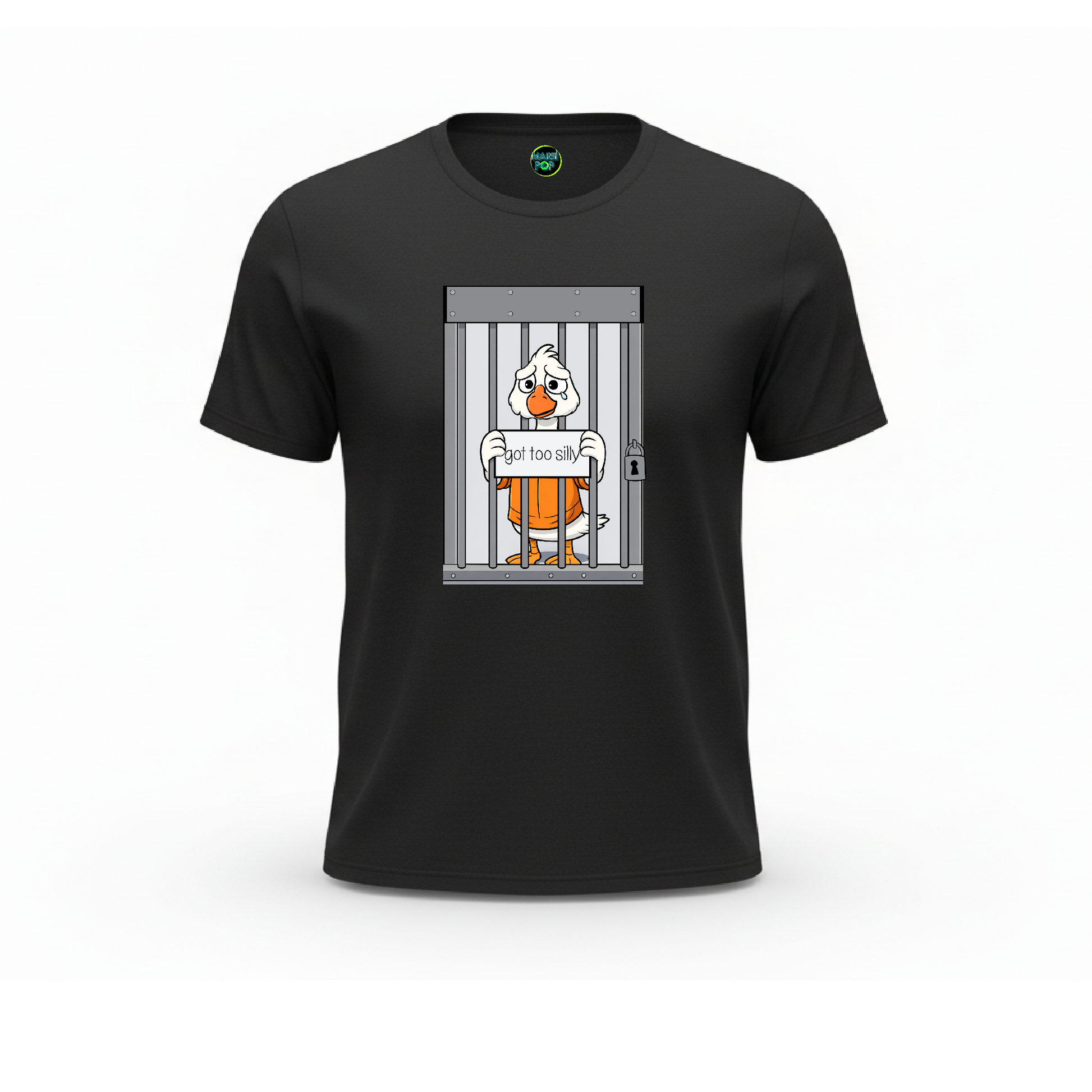 This silly goose got too silly! Featuring a tearful, goose behind bars holding a “got too silly” sign, this tee trades polished perfection for a moment of absurd silliness.