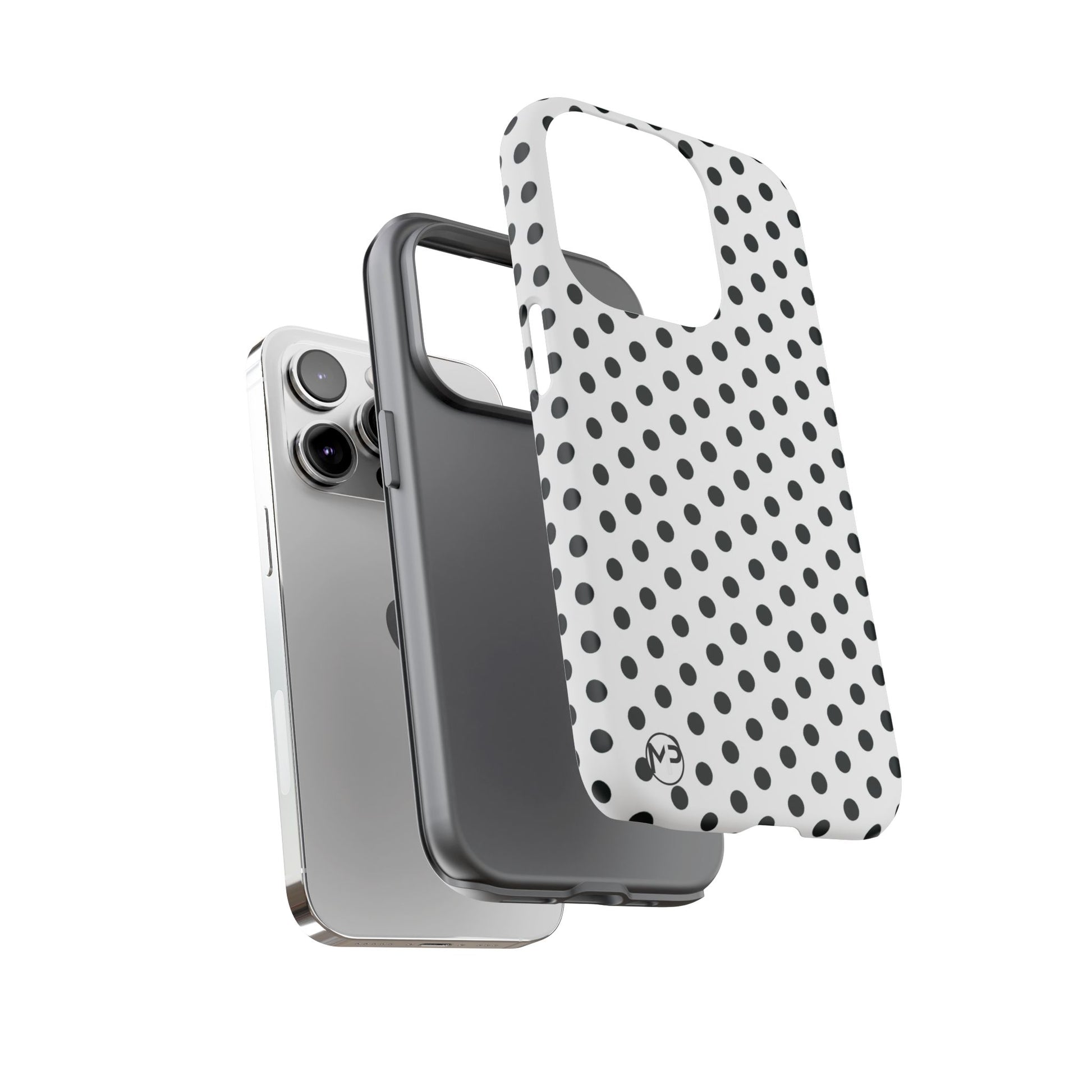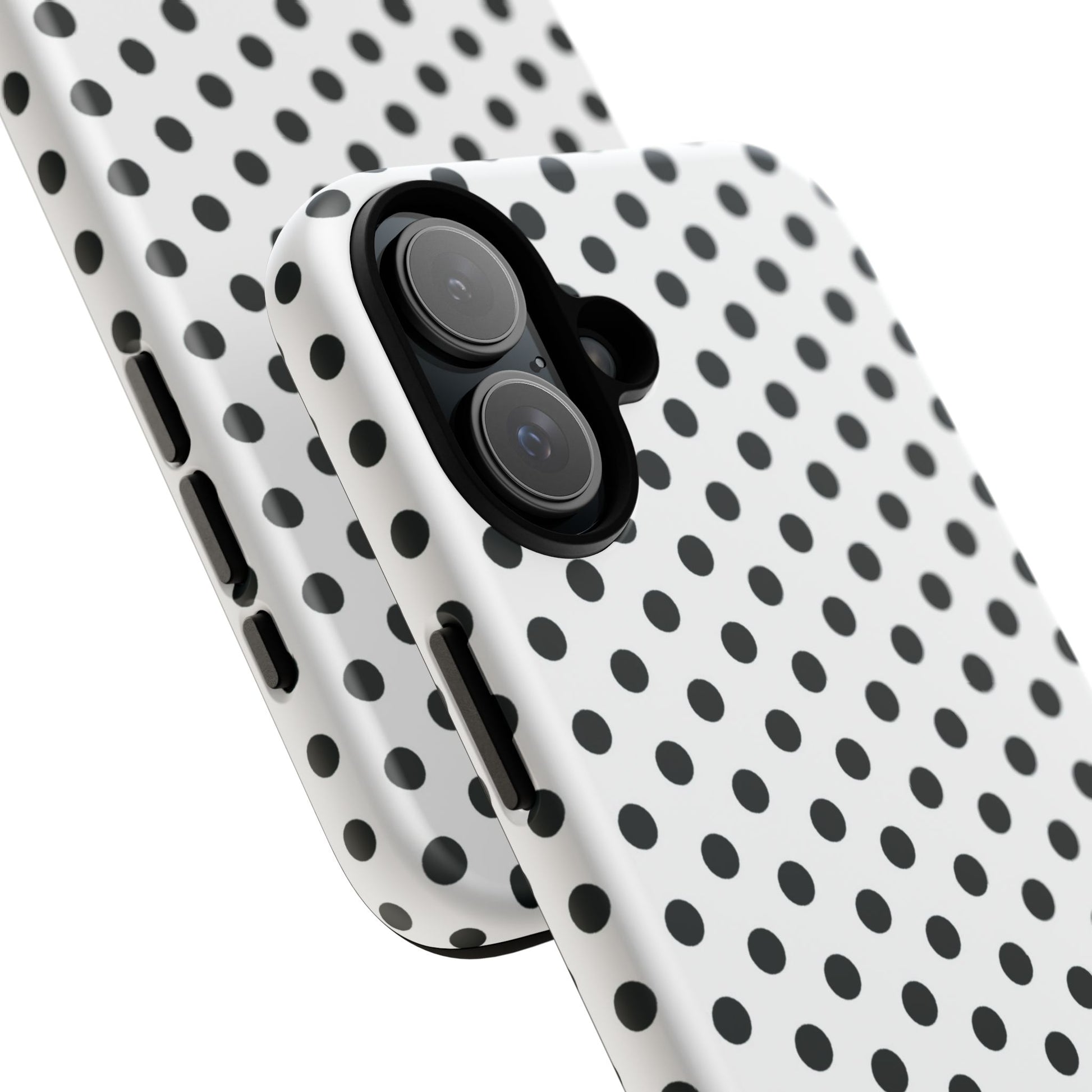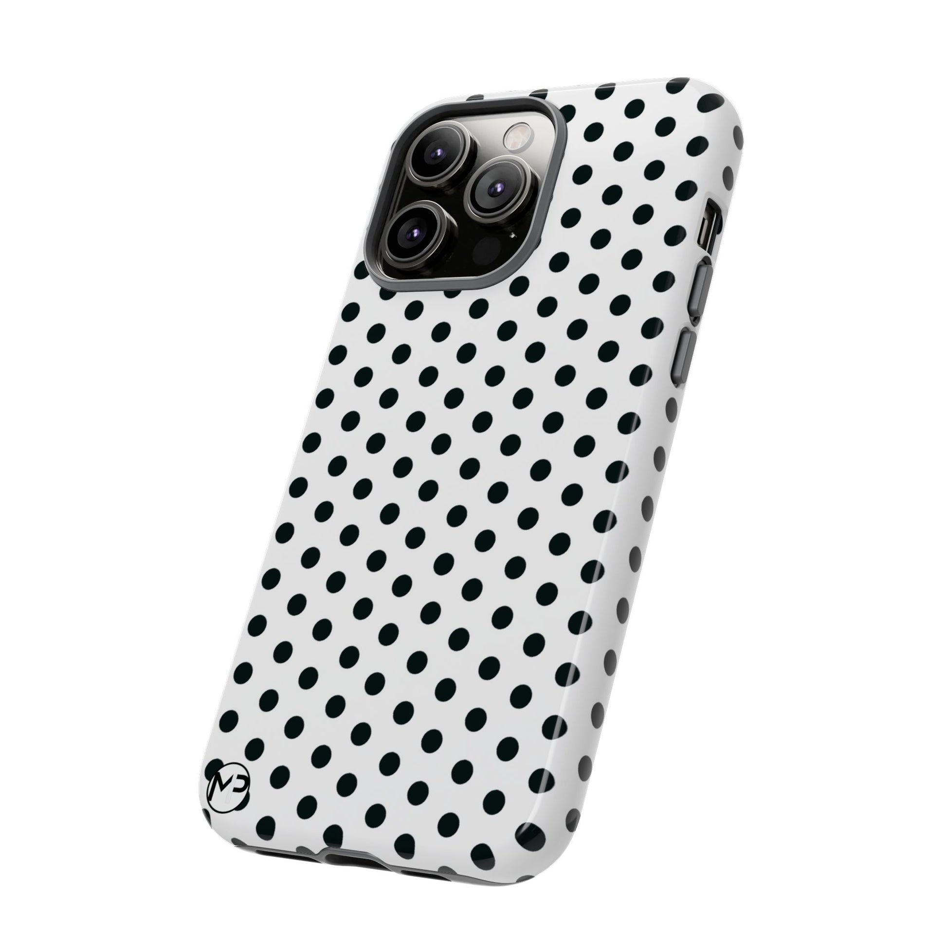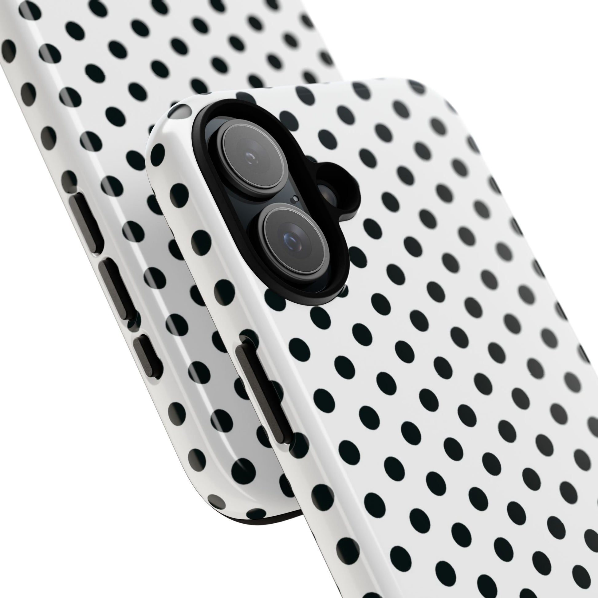 A sleek protective phone case with a timeless black polka-dot pattern on a clean white background. The dual-layer design pairs a rigid polycarbonate shell with a soft TPU silicone liner for confident drop protection and shock absorption. The 3D wrap print keeps the dots continuous across the edges, while UV protection helps maintain crisp contrast and resist outdoor fading. Slim profile, clear port access, and wireless charging compatibility keep everyday use effortless. This case reads classic and playful — an understated statement that moves from morning commute to late-night plans without missing a beat.