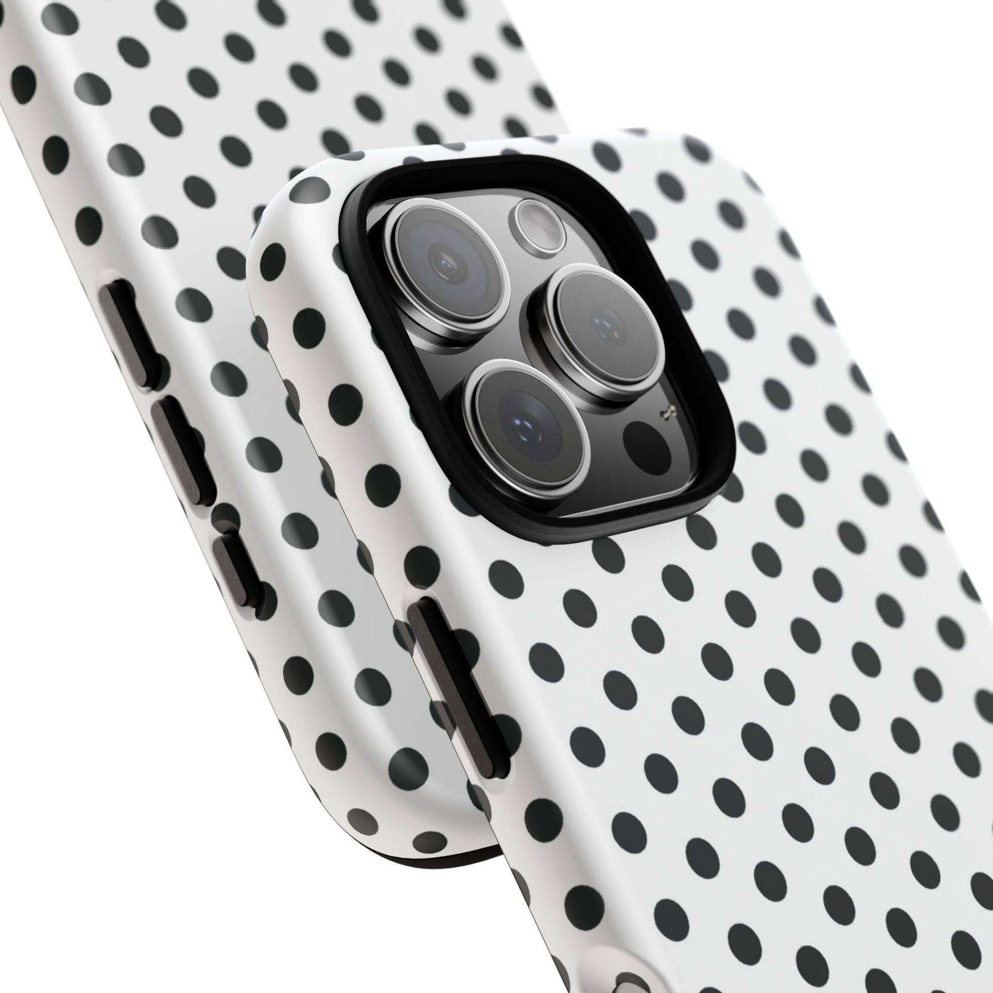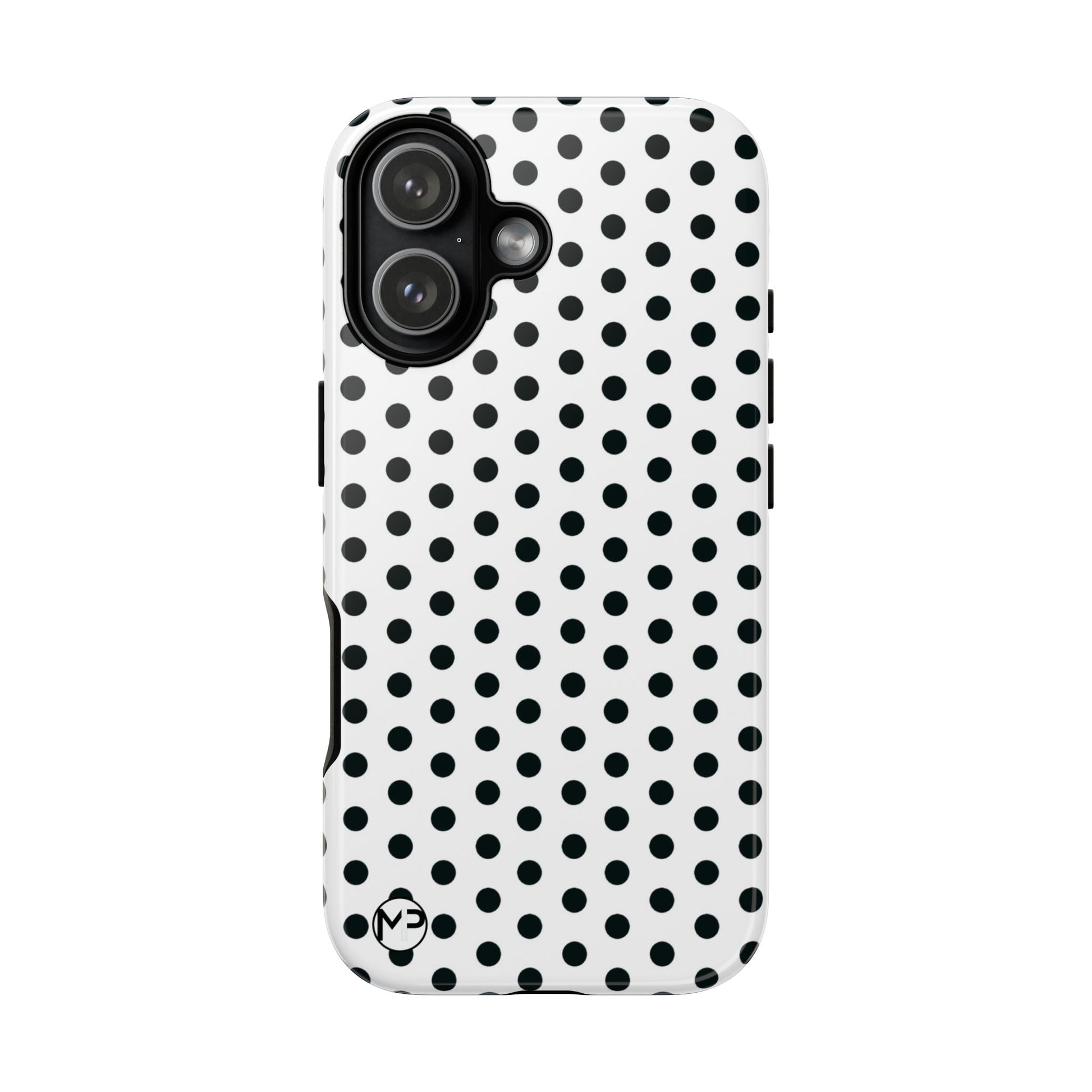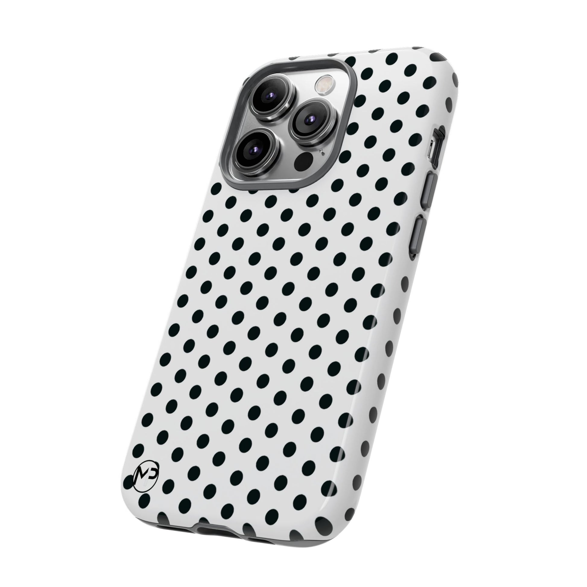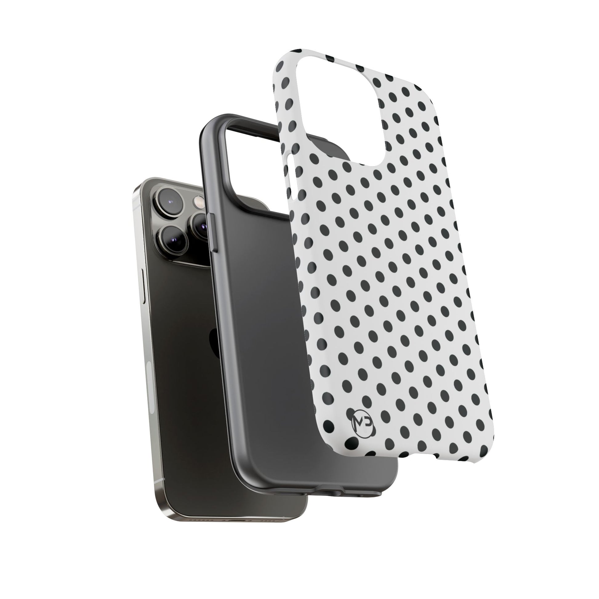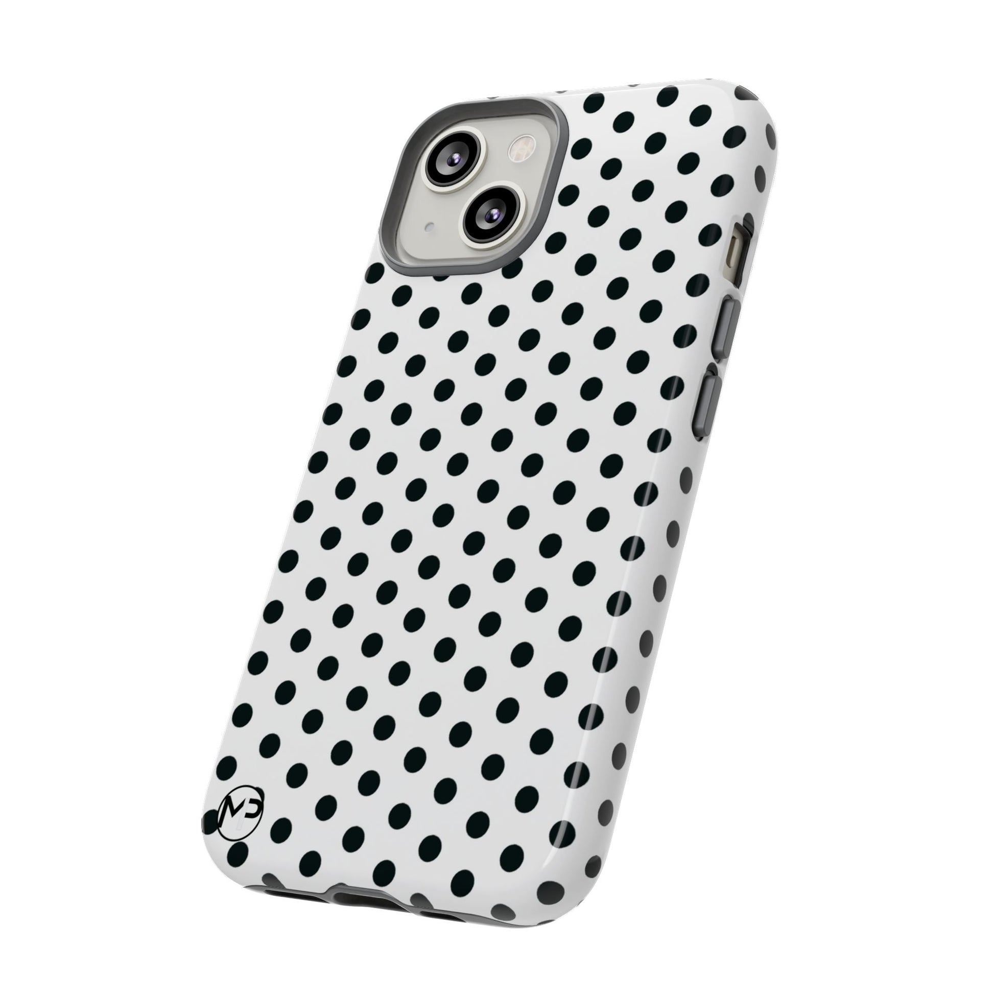 A sleek protective phone case with a timeless black polka-dot pattern on a clean white background. The dual-layer design pairs a rigid polycarbonate shell with a soft TPU silicone liner for confident drop protection and shock absorption. The 3D wrap print keeps the dots continuous across the edges, while UV protection helps maintain crisp contrast and resist outdoor fading. Slim profile, clear port access, and wireless charging compatibility keep everyday use effortless. This case reads classic and playful — an understated statement that moves from morning commute to late-night plans without missing a beat.
