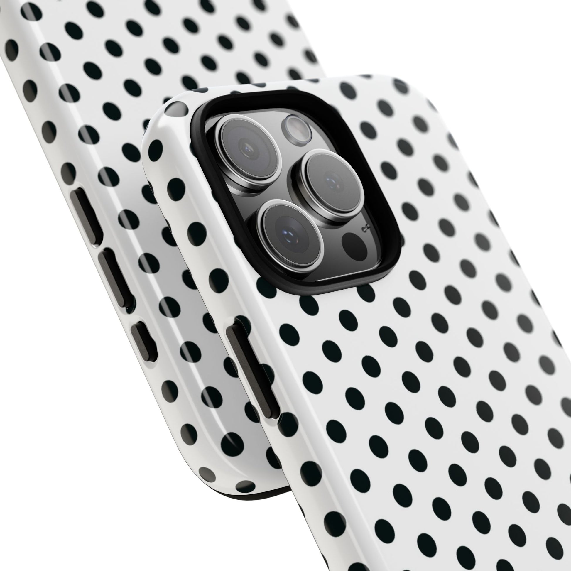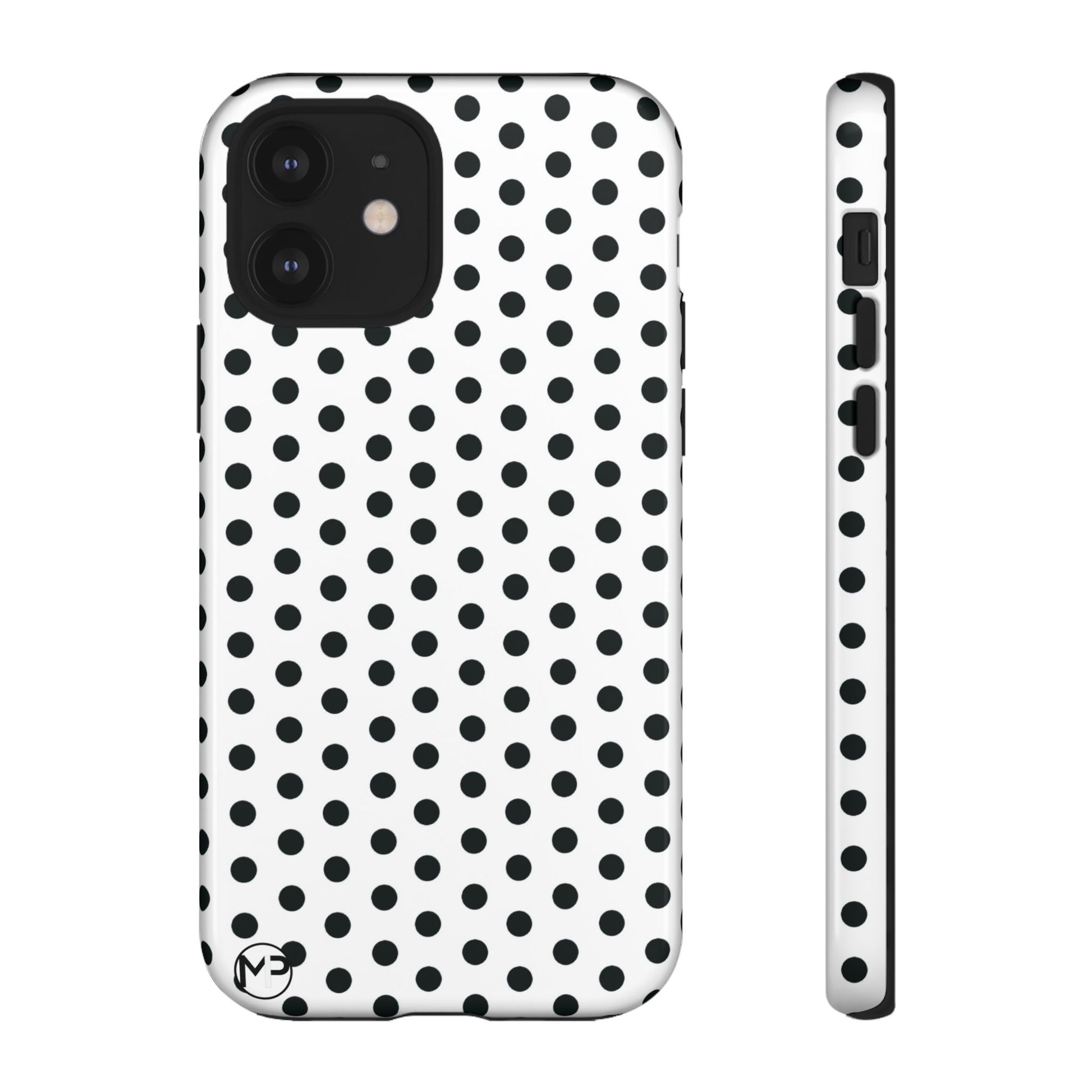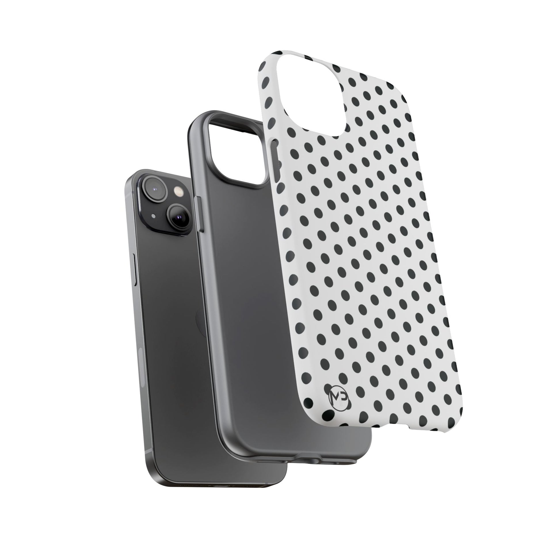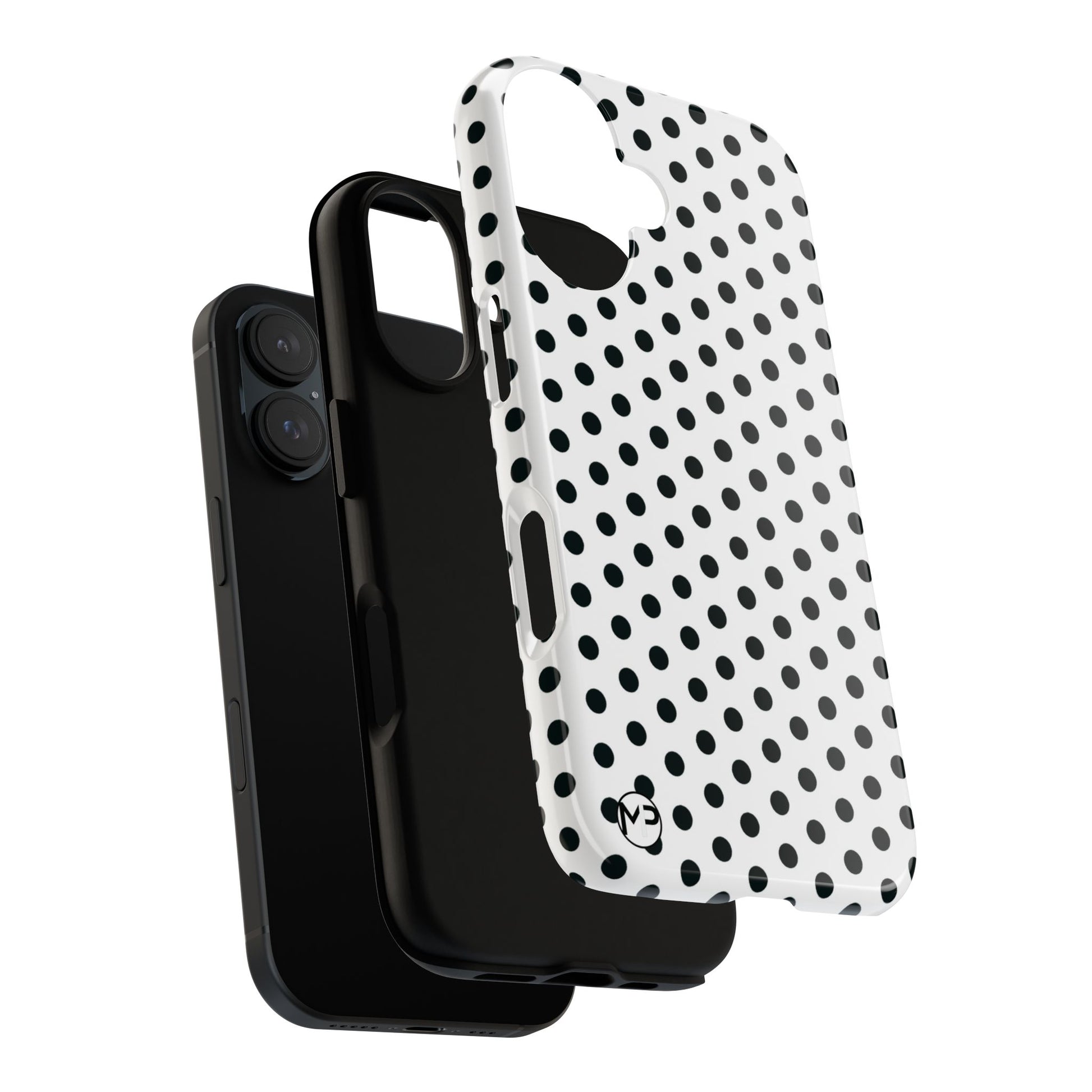 A sleek protective phone case with a timeless black polka-dot pattern on a clean white background. The dual-layer design pairs a rigid polycarbonate shell with a soft TPU silicone liner for confident drop protection and shock absorption. The 3D wrap print keeps the dots continuous across the edges, while UV protection helps maintain crisp contrast and resist outdoor fading. Slim profile, clear port access, and wireless charging compatibility keep everyday use effortless. This case reads classic and playful — an understated statement that moves from morning commute to late-night plans without missing a beat.